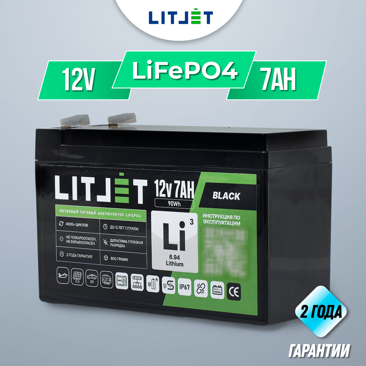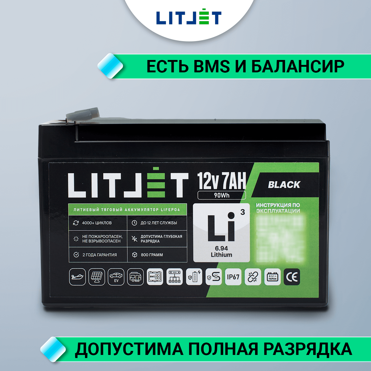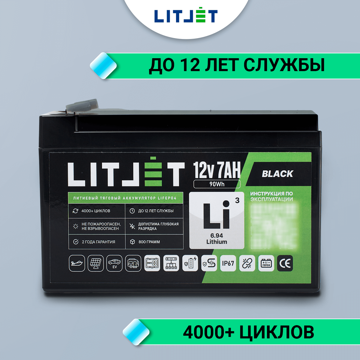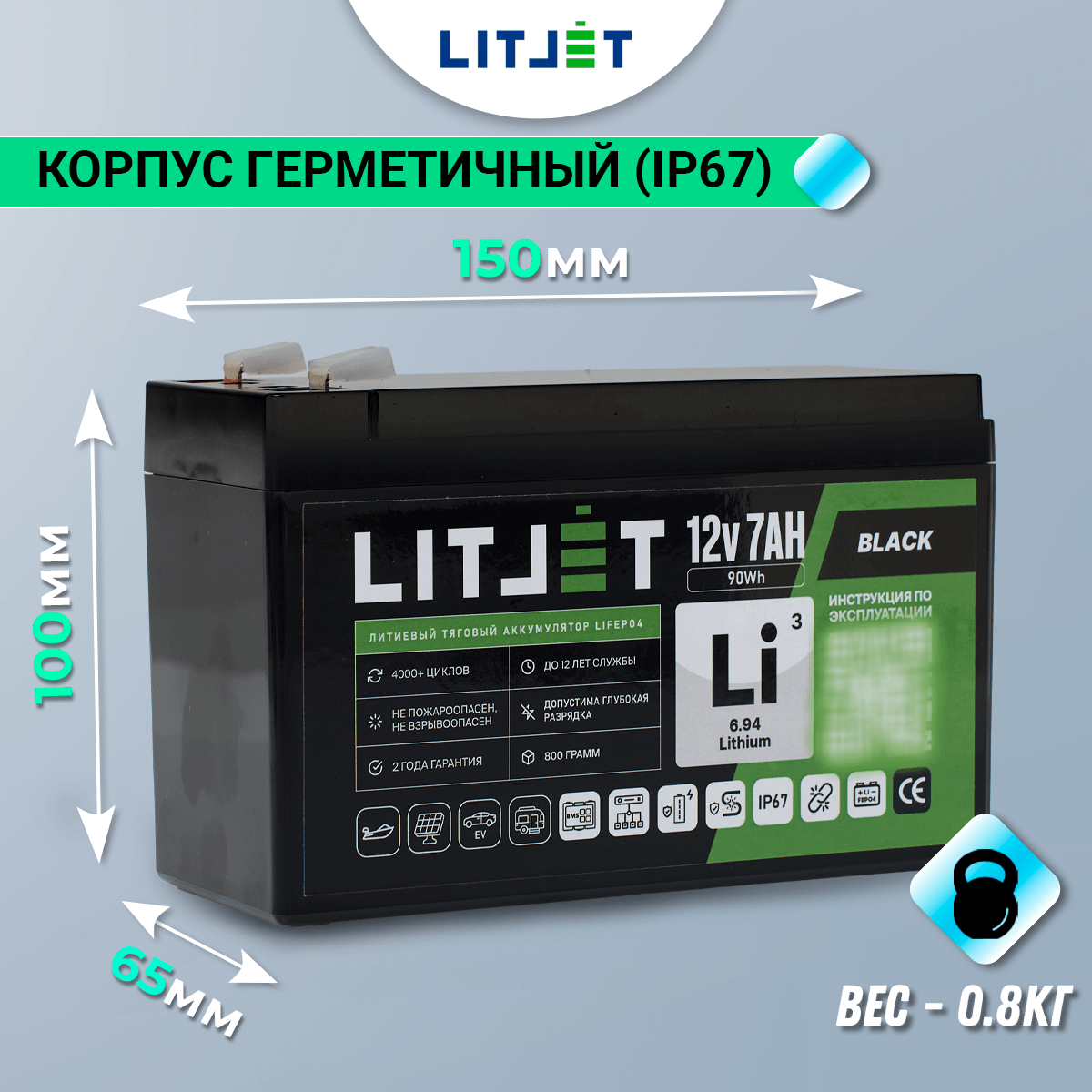 Аккумулятор LITJET BLACK LiFePO4 12V 7Ah 90Wh IP67 – надежный и долговечный источник энергии для ИБП (бренды: Eaton, Delta Electronics, Riello, Powercom, HIDEN, APC, CyberPower и другие), охранных систем, эхолотов, детских автомобилей, а также компактных солнечных батарей (простая замена свинцовой батареи).