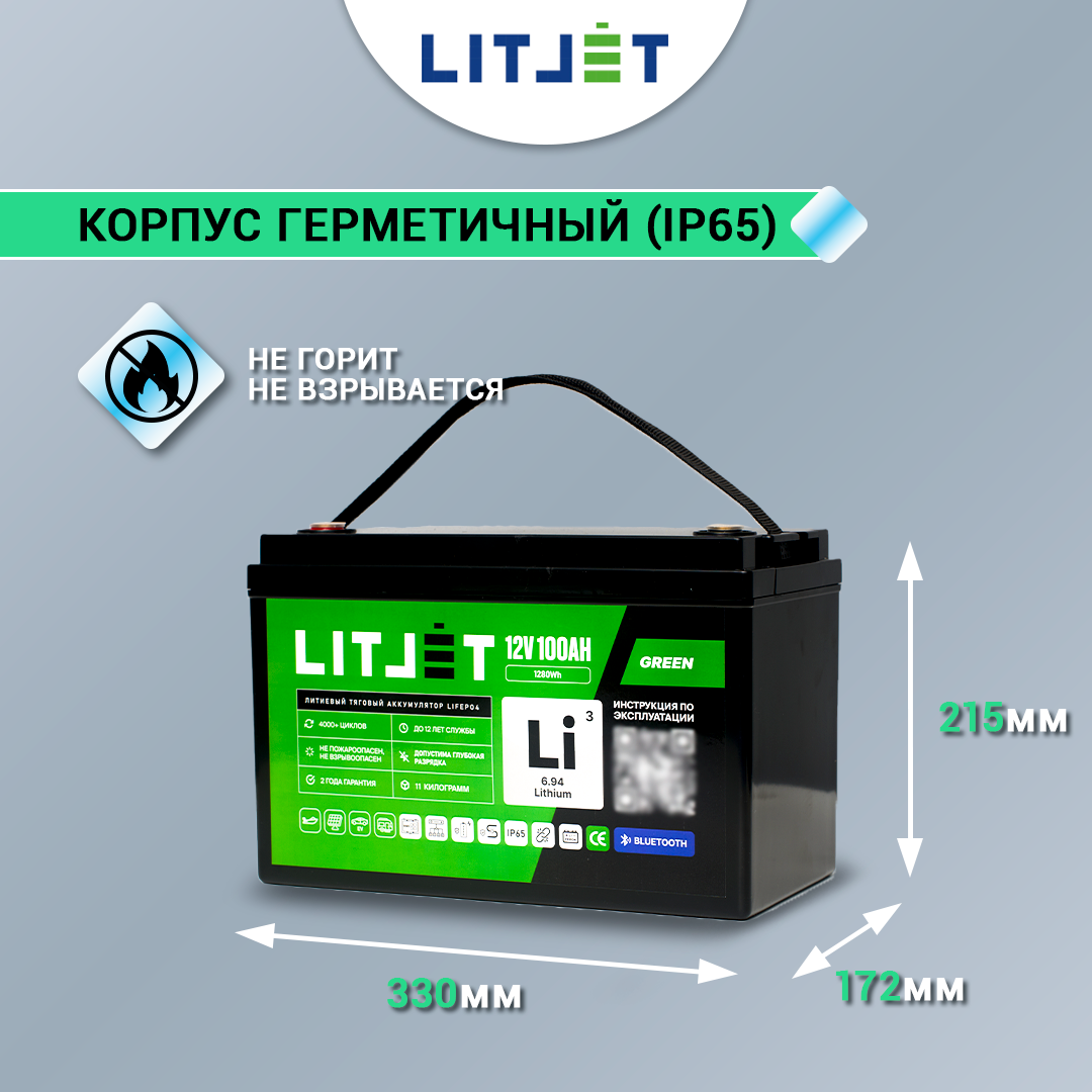 Аккумулятор LITJET GREEN LiFePO4 12V 100Ah – надежный и долговечный источник энергии для ИБП (бренды: Eaton, Delta Electronics, Riello, Powercom, HIDEN, APC, CyberPower и другие), охранных систем, эхолотов, детских автомобилей, а также компактных солнечных батарей (простая замена свинцовой батареи).