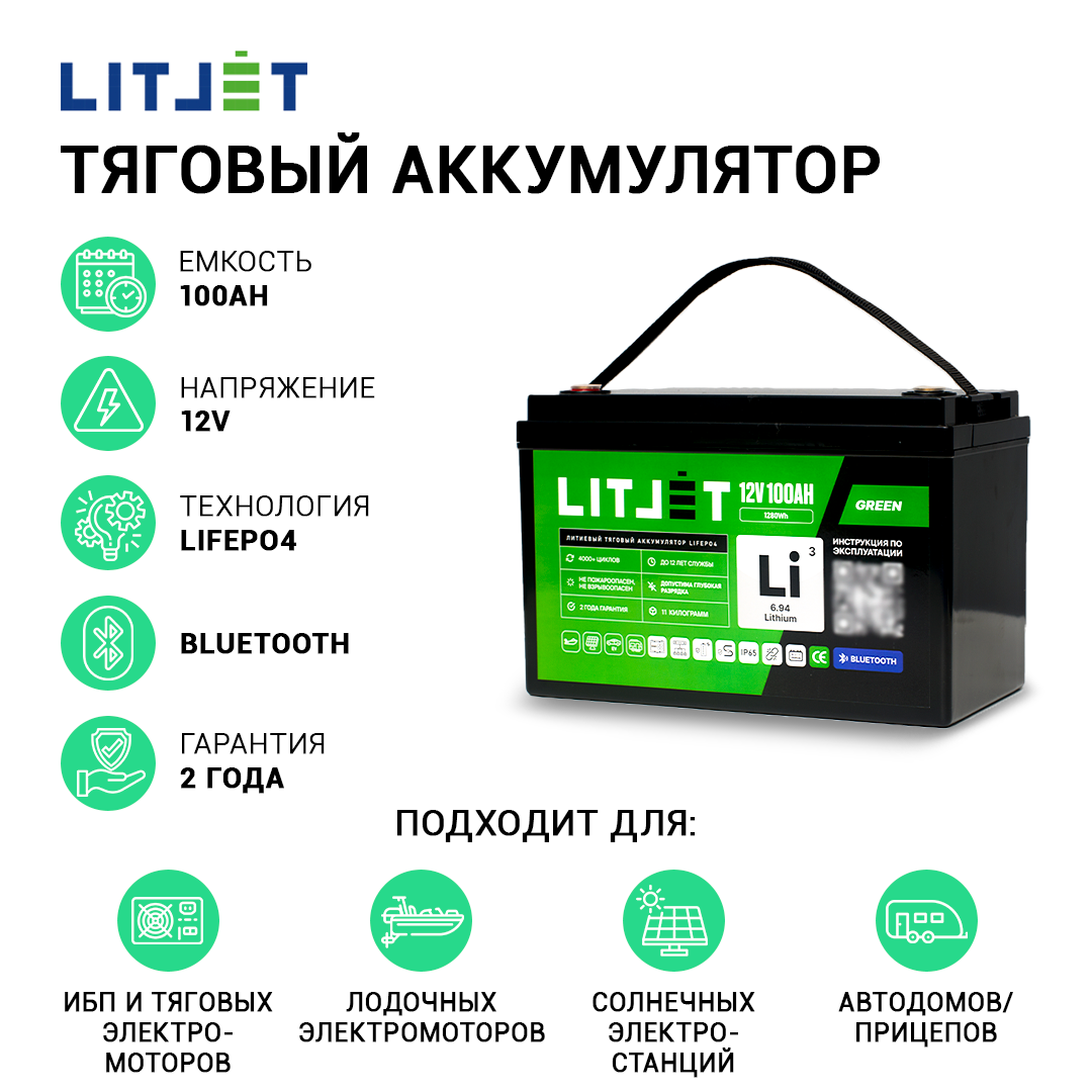 Литий железо-фосфатный аккумулятор (LiFePO4) тяговый LITJET GREEN имеет напряжение 12 вольт, предназначен для работы в глубоких циклах разряда и заряда. Не может быть использован для запуска ДВС. Относится к тяговым аккумуляторам.