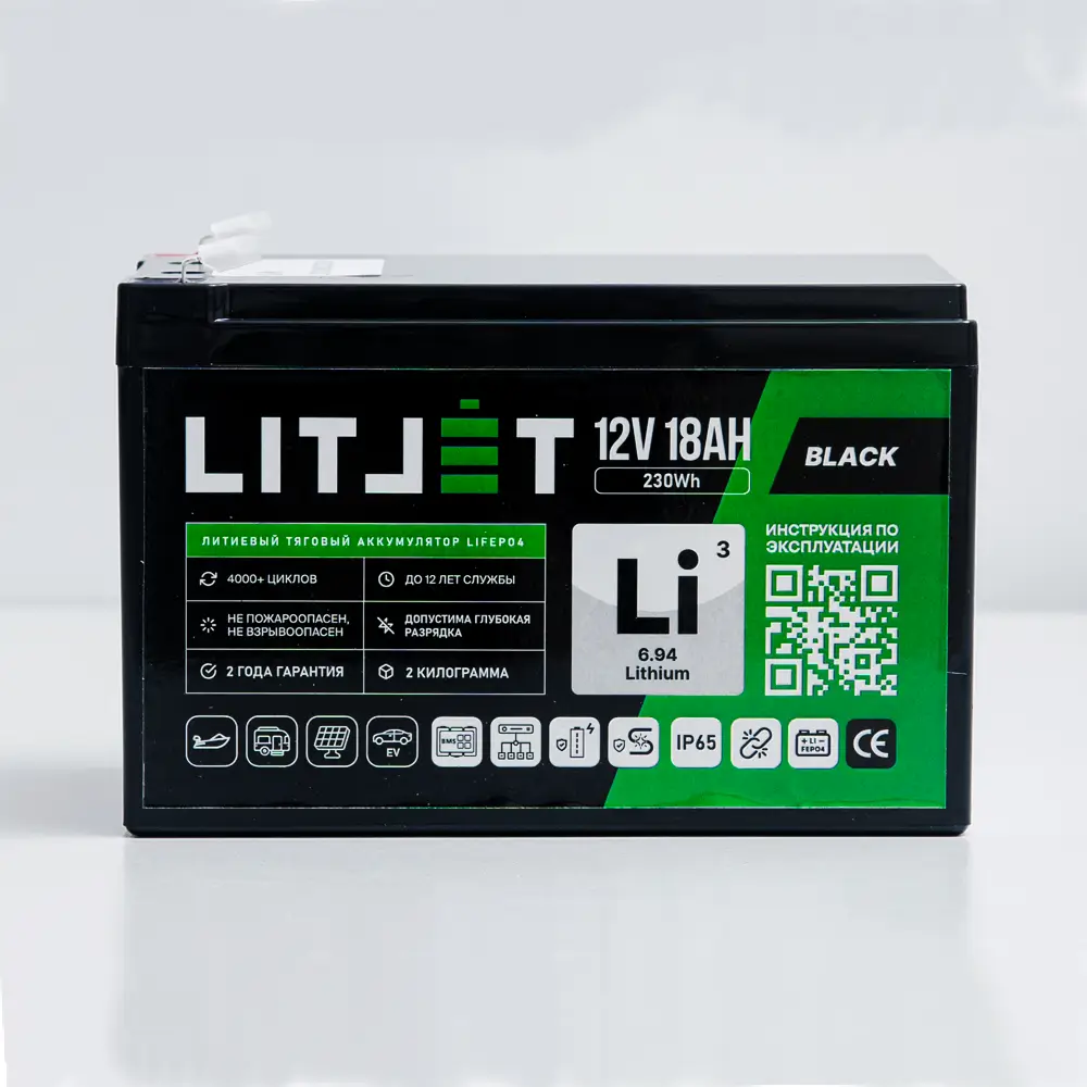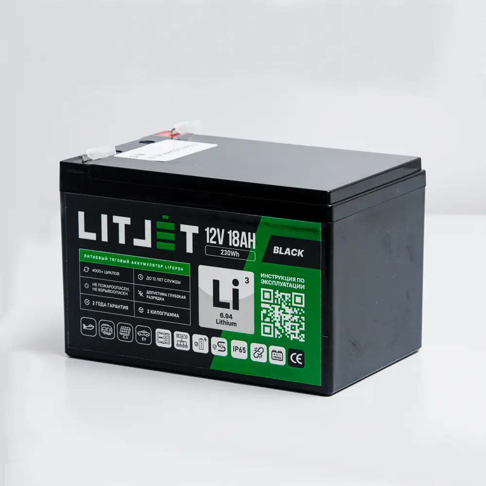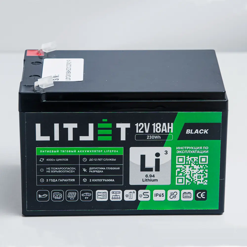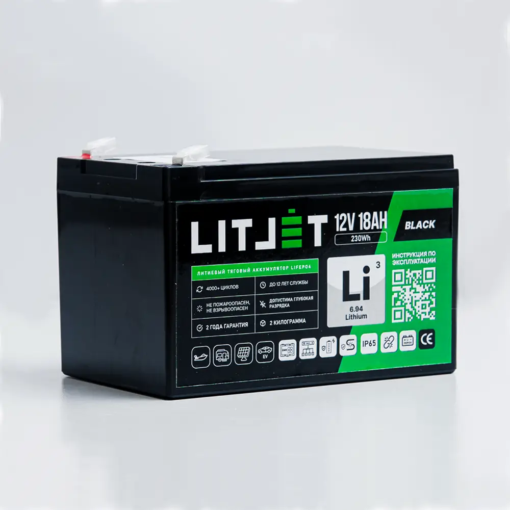 Литий железо-фосфатный аккумулятор (LiFePO4) тяговый LITJET BLACK имеет напряжение 12 вольт, предназначен для работы в глубоких циклах разряда и заряда. Не может быть использован для запуска ДВС. Относится к тяговым аккумуляторам.