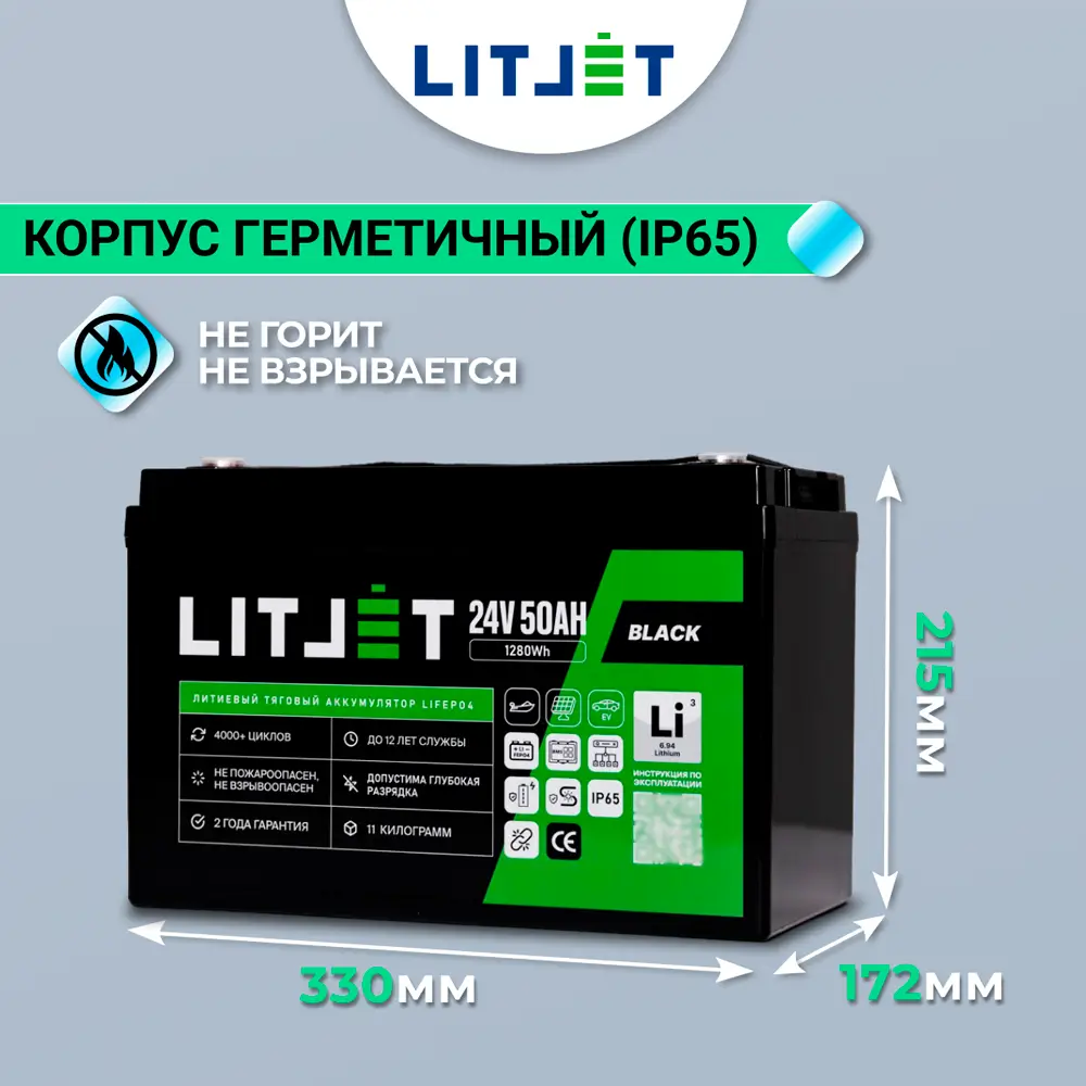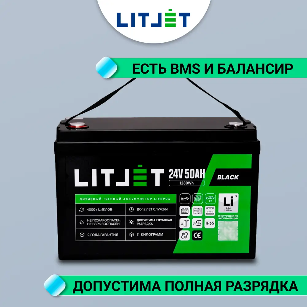 Литий железо-фосфатный аккумулятор (LiFePO4) тяговый LITJET BLACK имеет напряжение 24 вольт, предназначен для работы в глубоких циклах разряда и заряда. Не может быть использован для запуска ДВС. Относится к тяговым аккумуляторам.