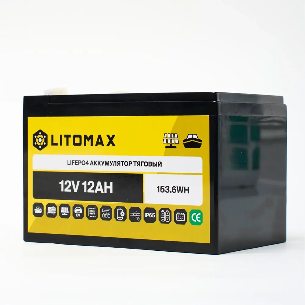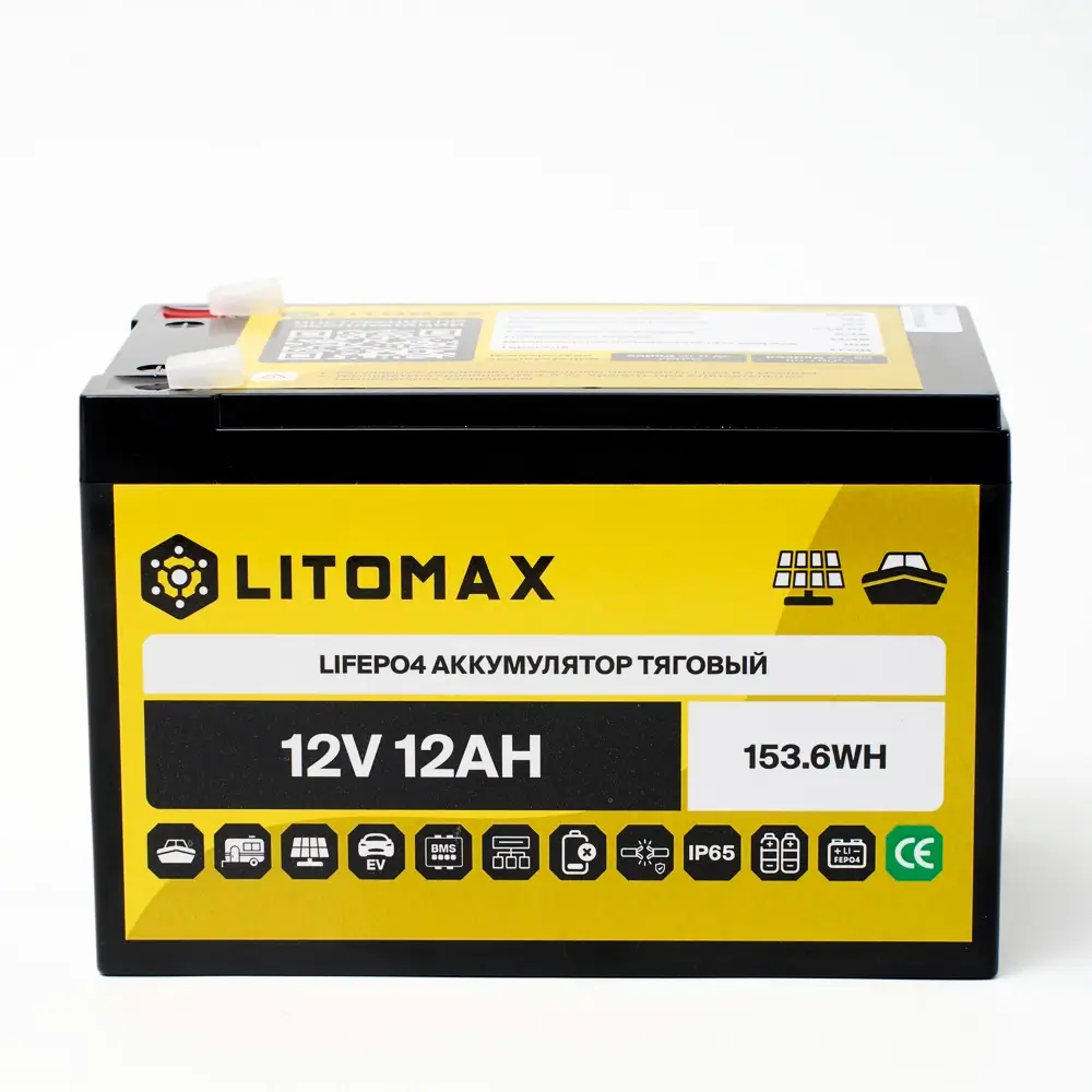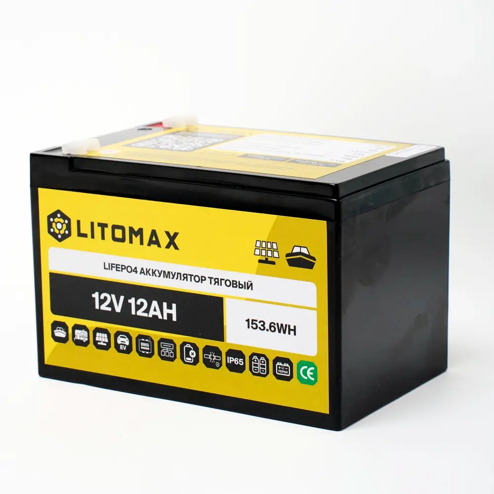Литий железо-фосфатный аккумулятор (LiFePO4) тяговый LITOMAX имеет напряжение 12 вольт, предназначен для работы в глубоких циклах разряда и заряда. Не может быть использован для запуска ДВС. Относится к тяговым аккумуляторам.