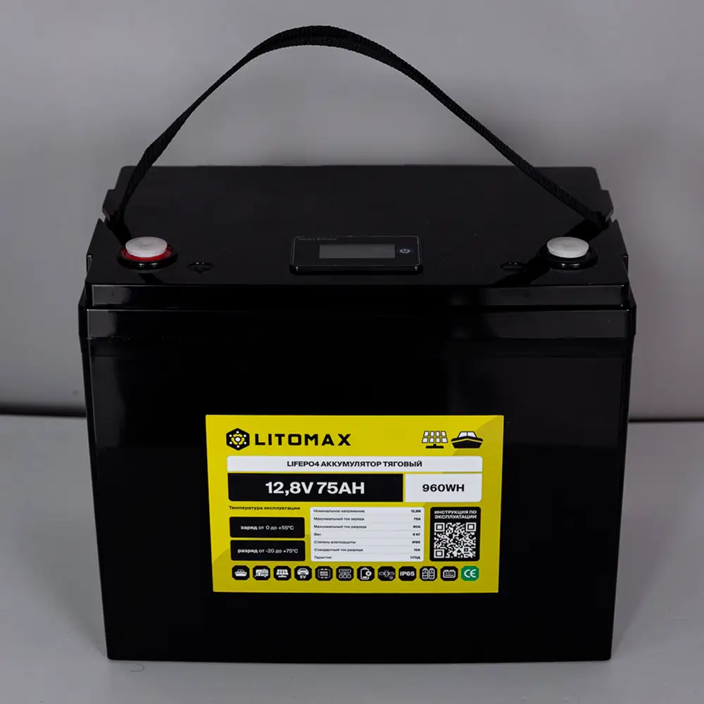 Аккумулятор LitoMax LiFePO4 12,8V 75Ah с цветным монитором – надежный и долговечный источник энергии для ИБП (бренды: Eaton, Delta Electronics, Riello, Powercom, HIDEN, APC, CyberPower и другие), охранных систем, эхолотов, детских автомобилей, а также компактных солнечных батарей (простая замена свинцовой батареи).