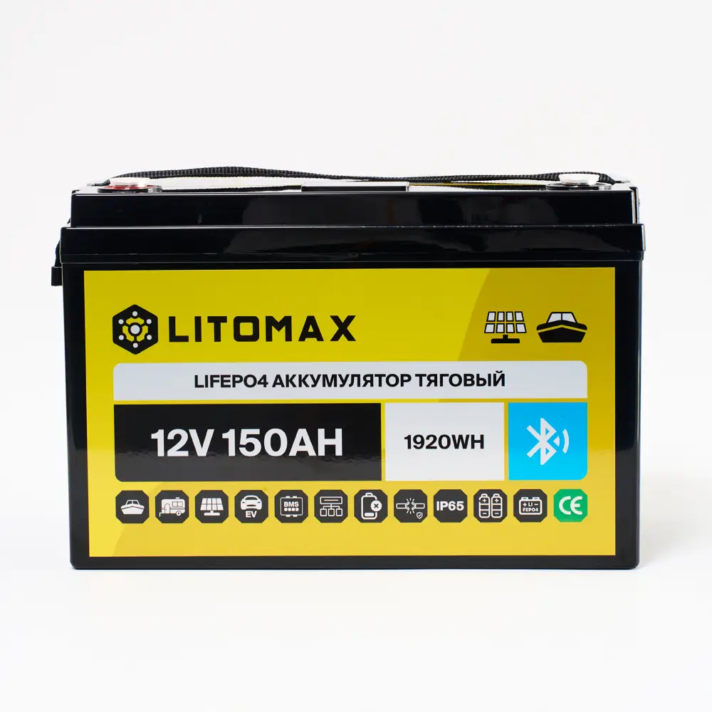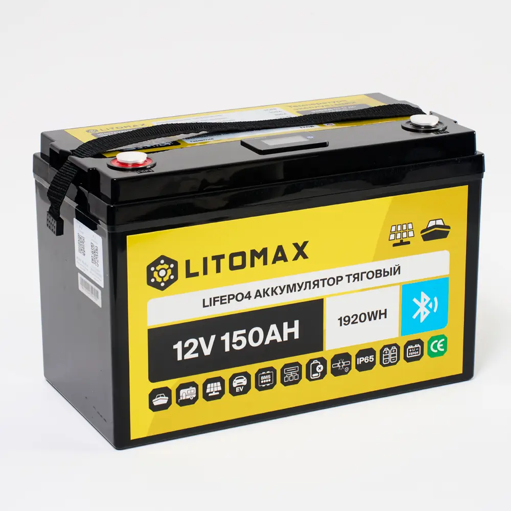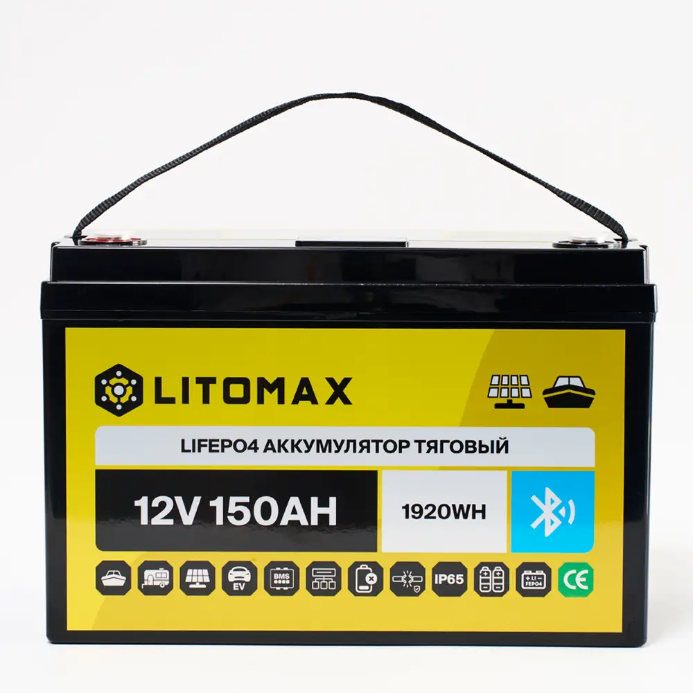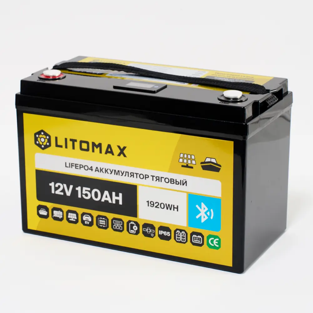 Литий железо-фосфатный аккумулятор (LiFePO4) тяговый LITOMAX имеет напряжение 12 вольт, предназначен для работы в глубоких циклах разряда и заряда. Не может быть использован для запуска ДВС. Относится к тяговым аккумуляторам.
