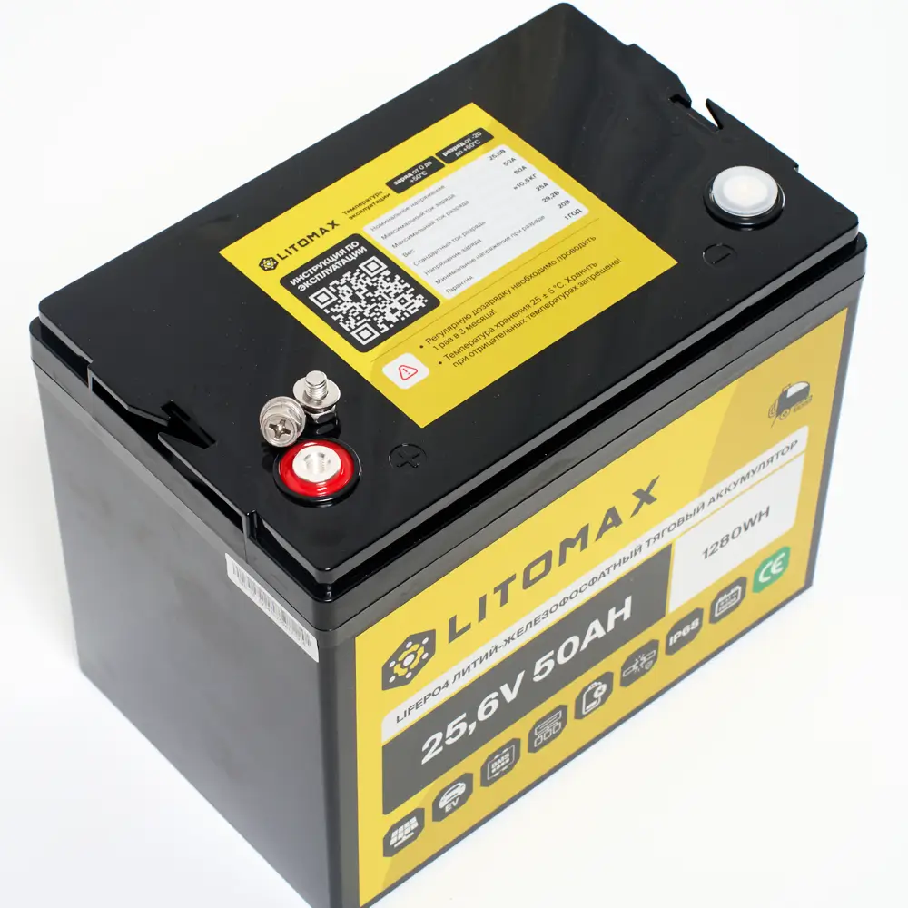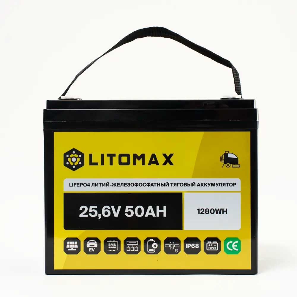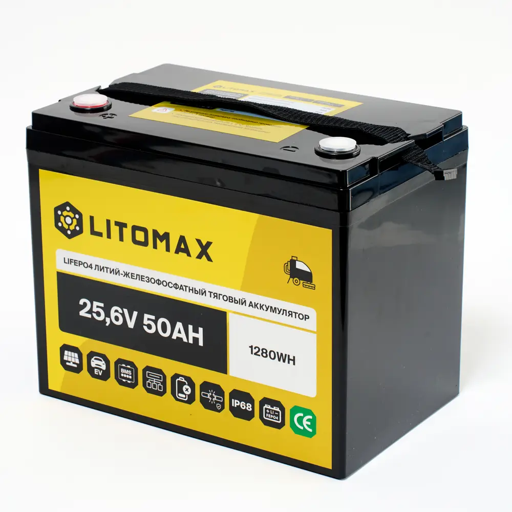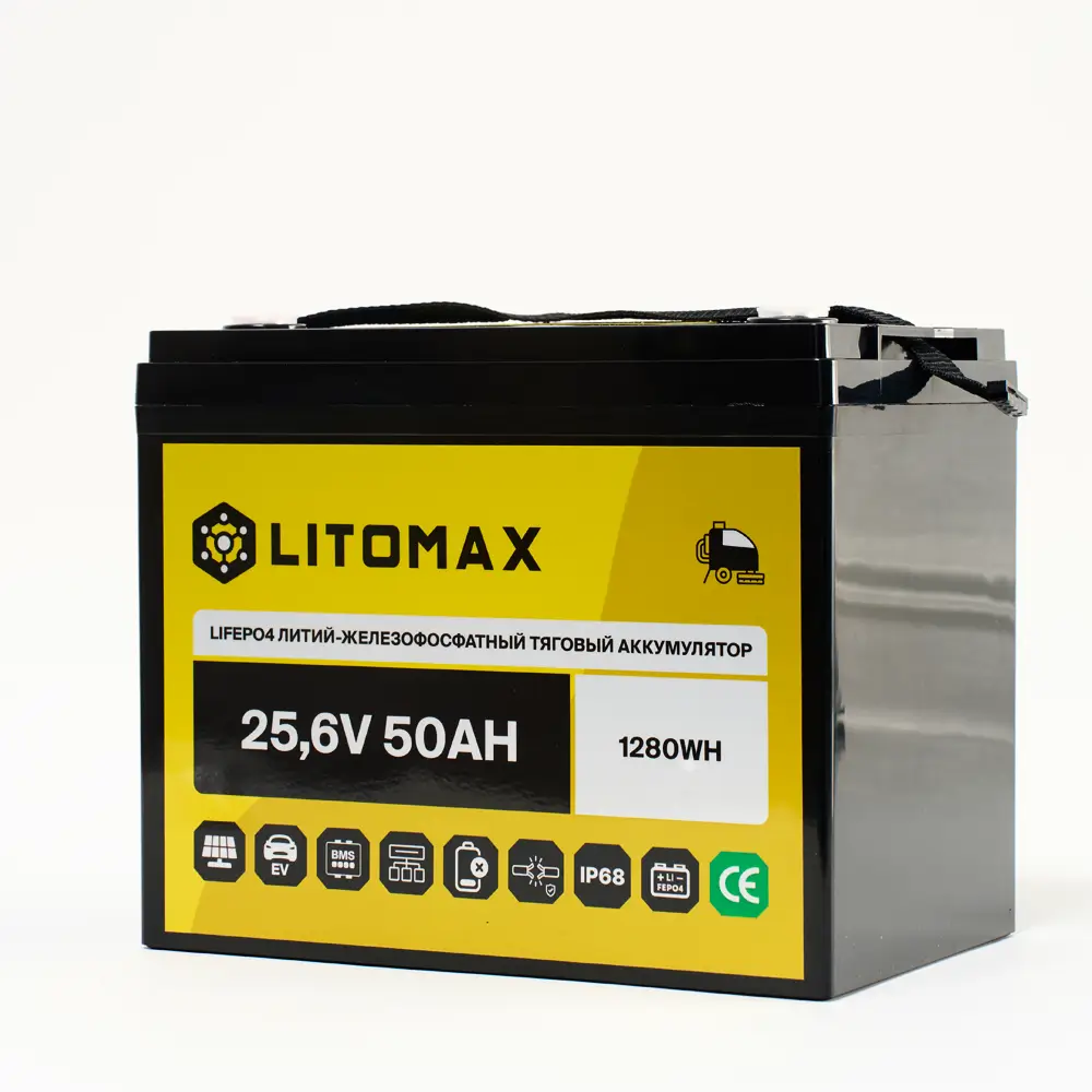 Литий железо-фосфатный аккумулятор (LiFePO4) тяговый LITOMAX имеет напряжение 24 вольт, предназначен для работы в глубоких циклах разряда и заряда. Не может быть использован для запуска ДВС. Относится к тяговым аккумуляторам.