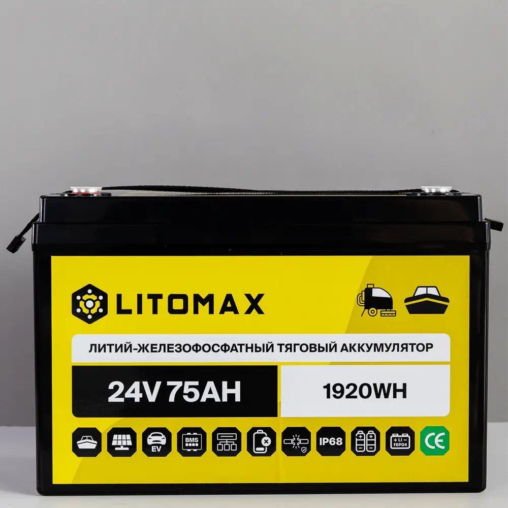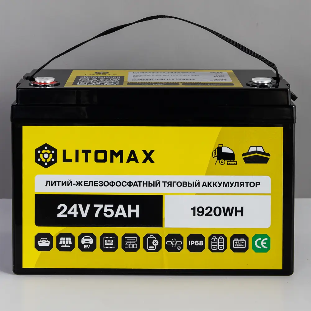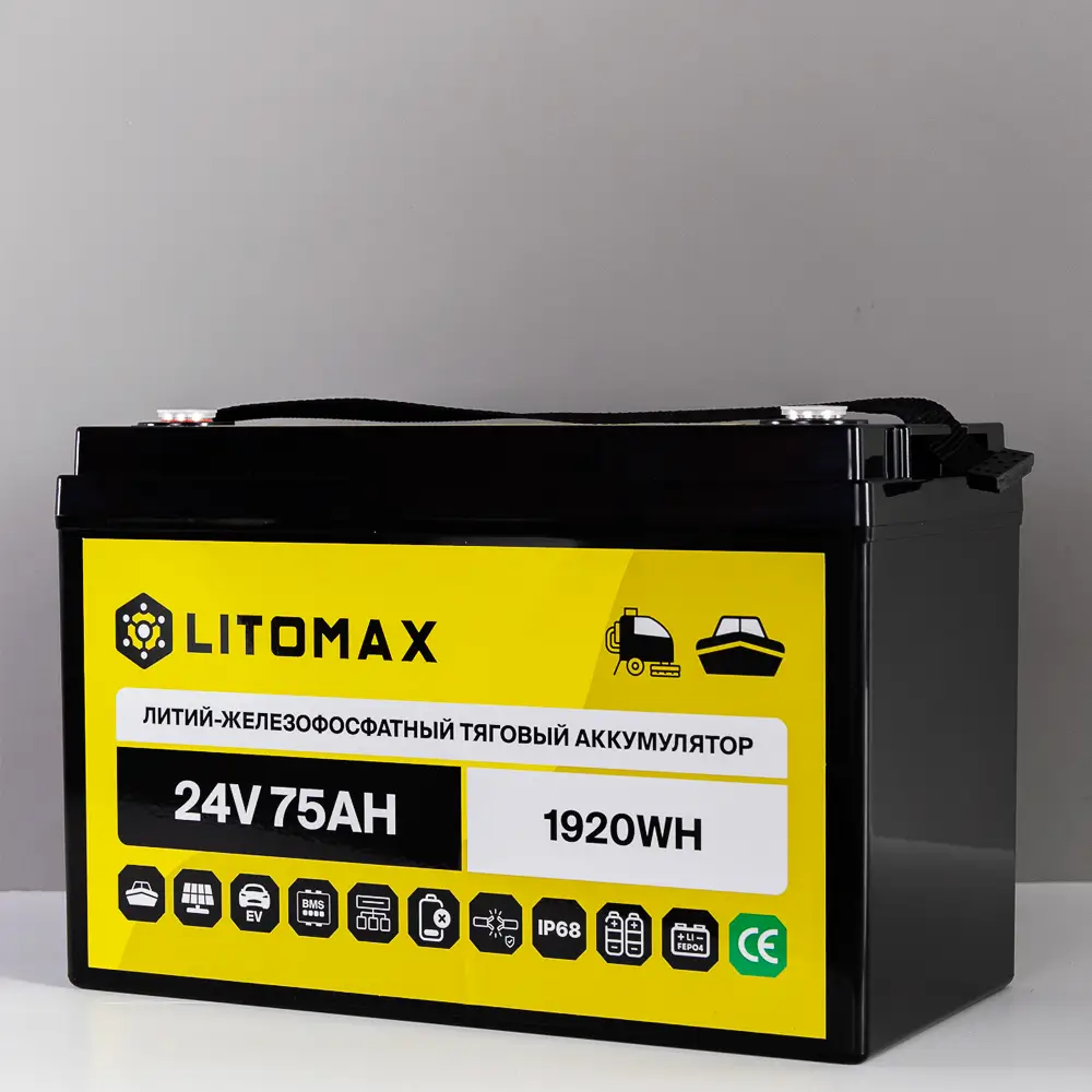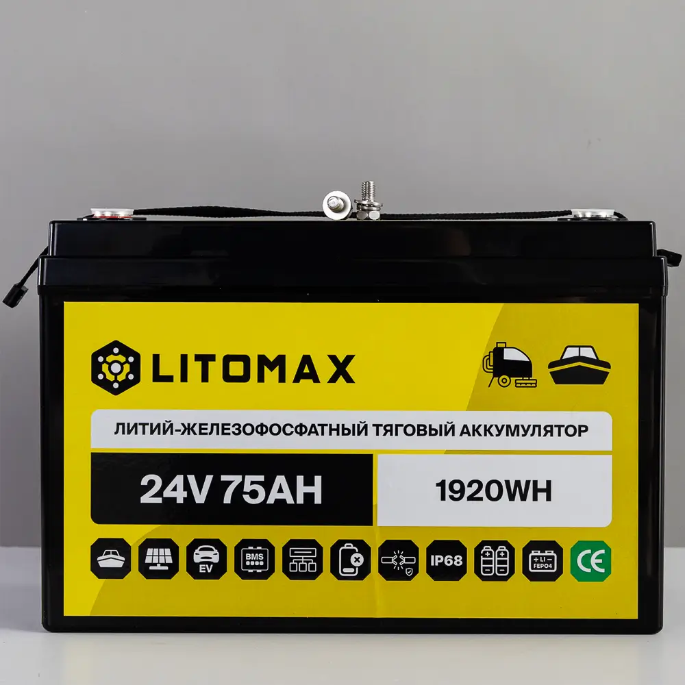 Аккумулятор LitoMax LiFePO4 24V 75Ah 1920Wh IP68 – надежный и долговечный источник энергии для поломоечных машин, ИБП (бренды: Eaton, Delta Electronics, Riello, Powercom, HIDEN, APC, CyberPower и другие), охранных систем, эхолотов, а также компактных солнечных батарей (простая замена свинцовой батареи). Используйте подходящие зарядные устройства — это продлит срок службы аккумулятора.