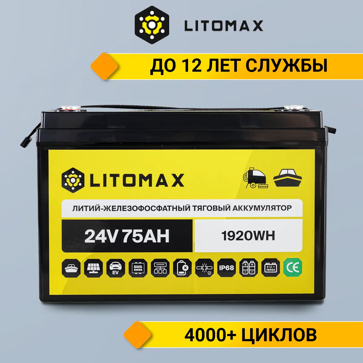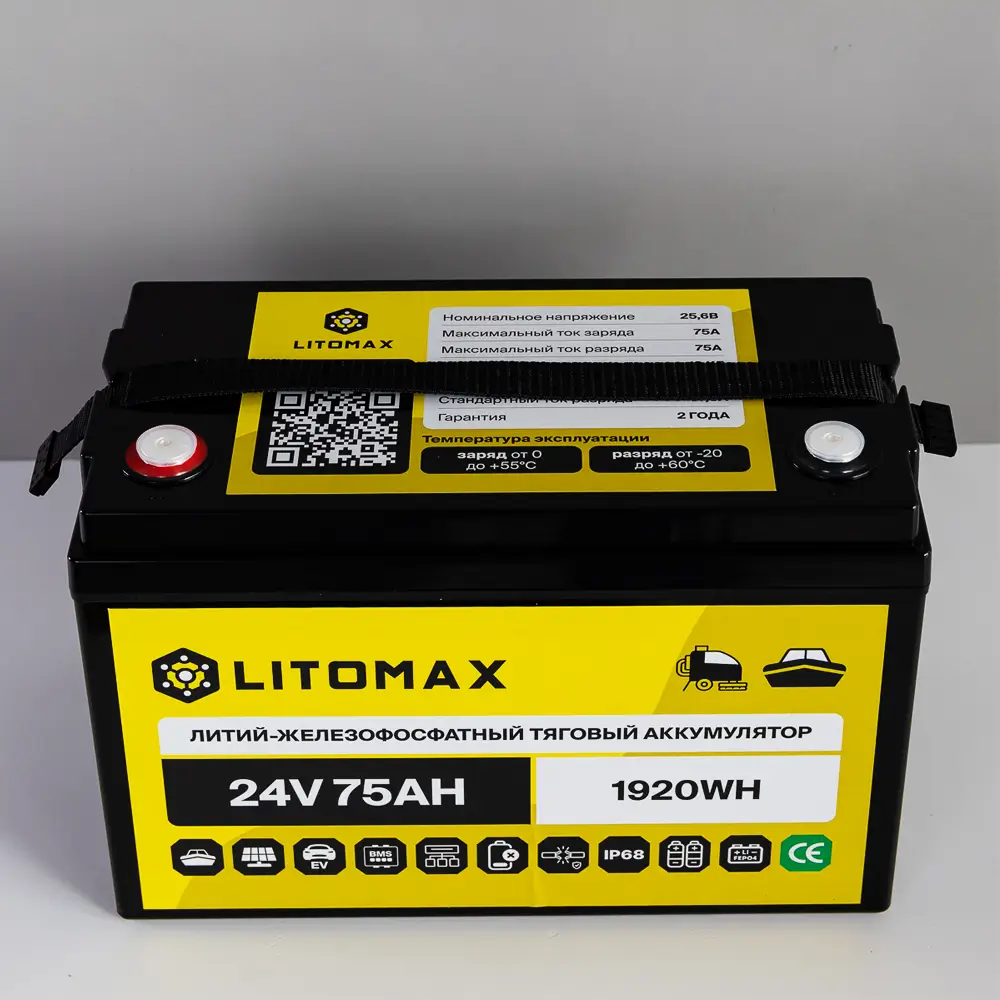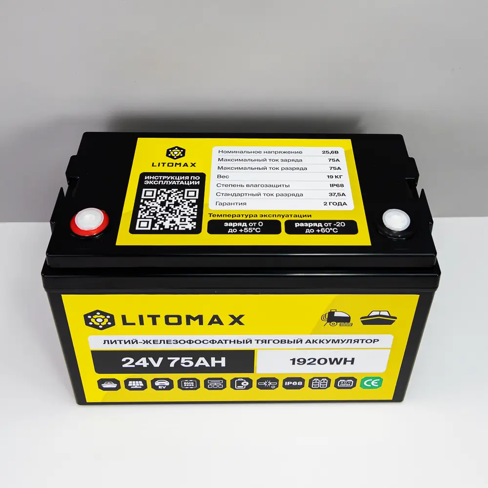 Аккумулятор LitoMax LiFePO4 24V 75Ah 1920Wh IP68 – надежный и долговечный источник энергии для поломоечных машин, ИБП (бренды: Eaton, Delta Electronics, Riello, Powercom, HIDEN, APC, CyberPower и другие), охранных систем, эхолотов, а также компактных солнечных батарей (простая замена свинцовой батареи). Используйте подходящие зарядные устройства — это продлит срок службы аккумулятора.