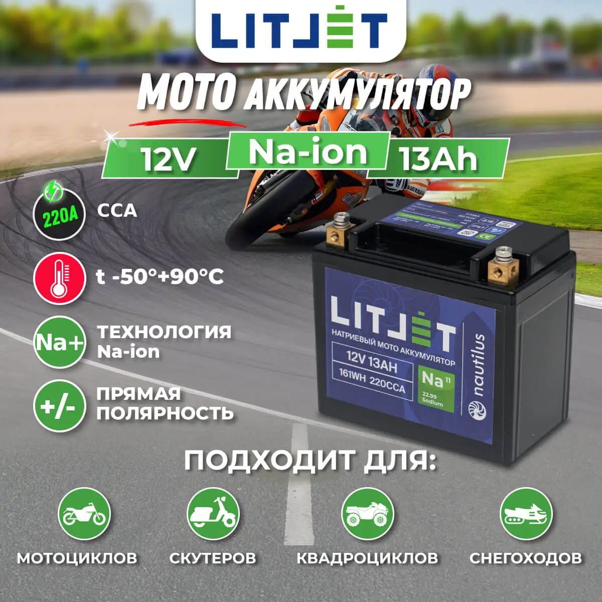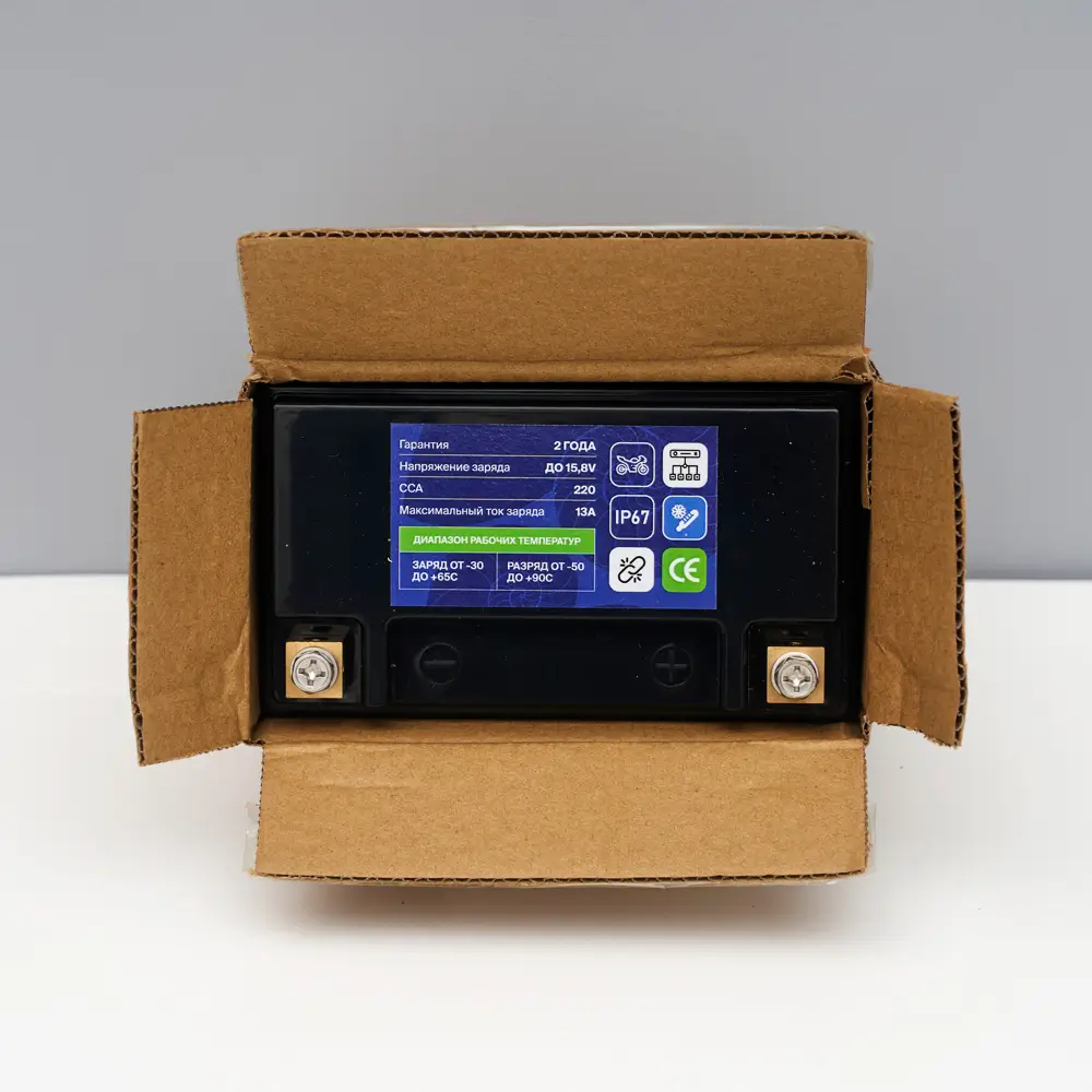 - Универсальная совместимость: подходит в качестве стартового аккумулятора для различных транспортных средств, включая мотоциклы, скутера, квадроциклы и снегоходы