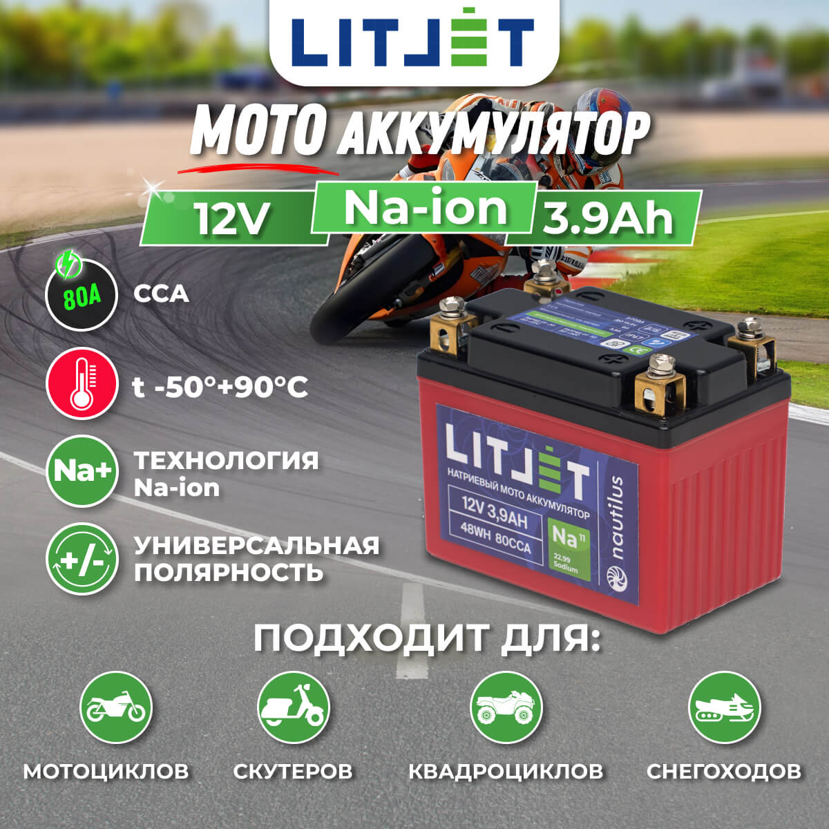 - Универсальная совместимость: подходит в качестве стартового аккумулятора для различных транспортных средств, включая мотоциклы, скутера, квадроциклы и снегоходы