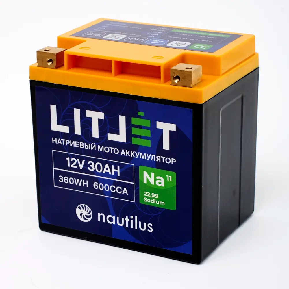 Натрий-ионный аккумулятор 12 В и ёмкостью 30 А/ч, представляет собой один из самых долговечных и надежных источников питания на рынке. Относится к стартовым натриевым аккумуляторам.